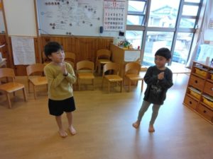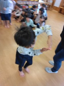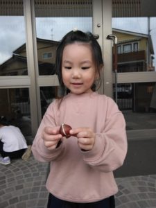 今日も、何人かの子たちから「こっちのコマがいい!強いもん!」とコマの指定があったので、コマを音楽が鳴っている間にお隣りへ回して、音楽が止まったら手元にあるコマで対決する!というルールを決めてすることにしました。