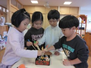 皆がお正月までに具材を作ったおせちが三段あり、その段の中からチームで相談し、一段選びます。
