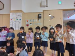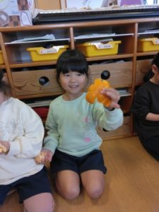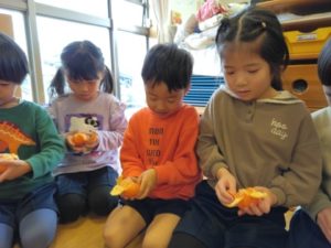 みかんの皮のお花剥きチャレンジもしました!お花の形になるようにちぎれずに剥くことは難しいのですが、みんなちぎれないよう慎重に、とっても上手に剥くことができていましたよ!