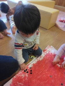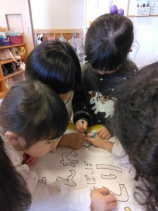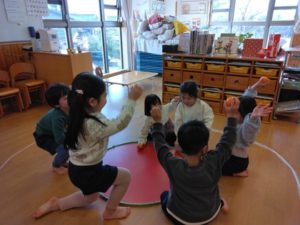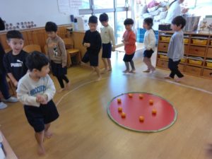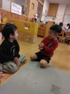 今日も、何人かの子たちから「こっちのコマがいい!強いもん!」とコマの指定があったので、コマを音楽が鳴っている間にお隣りへ回して、音楽が止まったら手元にあるコマで対決する!というルールを決めてすることにしました。