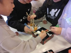 箸の持ち方が上手な子が増えてきて来ました!まだ、「箸難しい…」と言う子も箸の持ち方を意識しながら集中してのせていましたよ!