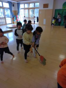 「何で掃除する?」と聞くと、「ぞうきん!」「ほうきもあったらいいんじゃない?」という意見が出てきたのでさっそく準備をしてホールへ