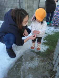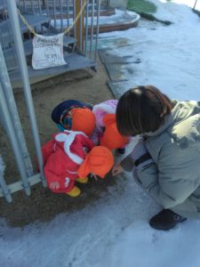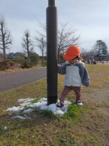 しばらく経つと“寒い~” と固まる子や”手が冷たくて雪を触るのがイヤイヤ~”な子など冬の寒さを知った子どもたちです(笑)