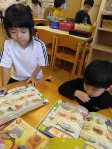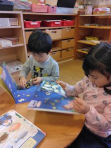 今月の月刊絵本のこのページでは、「どのお魚にしますか~?」「マグロですね。はいどーぞ!」などと子どもたち同士でお魚屋さんが開かれていました!