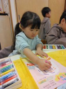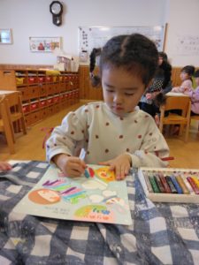 塗り絵の手袋は、可愛らしく虹色にしたり自分の好きな色1色にしたり、お母さんの好きな色にしたりとそれぞれ綺麗に塗っていました!