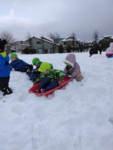 雪も沢山降り、子どもたちのだいすきな雪遊びをすることができました。 公園でソリ遊びなどを楽しみました!なかなかソリが前に進まなくて困っているお友だちの後ろを押してあげる優しい姿なども見られましたよ(^^) とっても楽しそうな子どもたちでした!