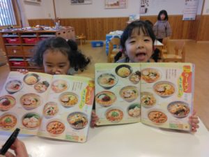 ラーメンが大好きな子どもたち。絵本を広げて友達と「これが好き」と指差したり、「いらっしゃいませ〜どれにしますか〜」とお友達を呼んで、ラーメン屋さんを開いたりして遊んでいましたよ。