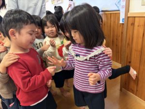 じゃんけん汽車ポッポッでは、じゃんけんの勝ち負けが分かるようになった子どもたち。「ゴーゴーゴーゴーじゃんけん列車」と歌いながら、友達とじゃんけんをして繋がることを楽しんでいます!
