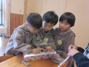 友だちと協力して退治するため、大きな箱に作った豆を入れていました。