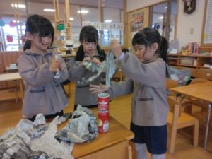 お面だけではなく、鬼退治に必要な豆も新聞紙で手作りしました。