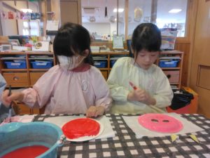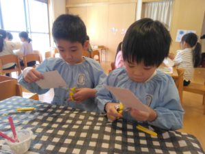 鬼の角を丸めて、立体感を出したり、画用紙に自分で一から書いて切り取ったり、