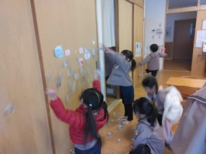 そして、当日しっかり投げられるように、鬼の絵を描いて、壁に貼り付けて