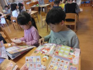 “上から1番目、右から2番目”はどのお菓子かな?と指でシールを数え、友達と確認し合いながら貼ることを楽しんでいました。