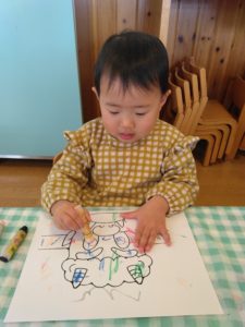 色を付ける前に、鬼のお面を見せて「だれかわかる?」と聞くと