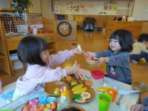 Sちゃん「かして~」Y ちゃん「いや~よ…」でしたが、Yちゃんはその後、なんと!Sちゃんにお料理を作って渡してあげていました!Sちゃんはにっこり笑顔で受け取り、Y ちゃんも嬉しそう!