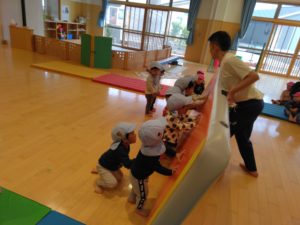 四つ這いになって歩き、お兄ちゃんお姉ちゃんの真似っこ!
