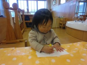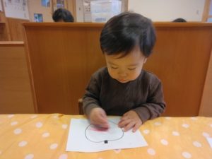 色塗りはしっかりとクレヨンを持ち、力強く塗り進めることが出来るようになり、指先を細かく動かせるようになってきていることに成長を感じました。