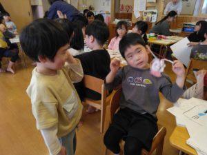 ペンダントを渡すときに年長さんの笑った顔を見たり「ありがとう」とお礼を言ってもらったりして、ちょっぴり照れていたみんなでした