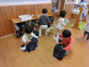 ジャンパーを脱いで廊下に掛けたり、リュックやカバンからタオルと連絡帳を取りだしたりと