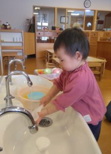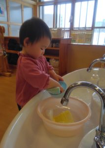 最近よくままごと遊びをしているので、最後にお茶碗洗いをしてみよう。