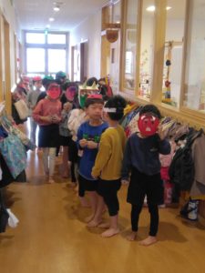 子どもたちは登園するなり「今日鬼来る?」「怖い…」と心配していて、すぐお面をかぶって備えていました。