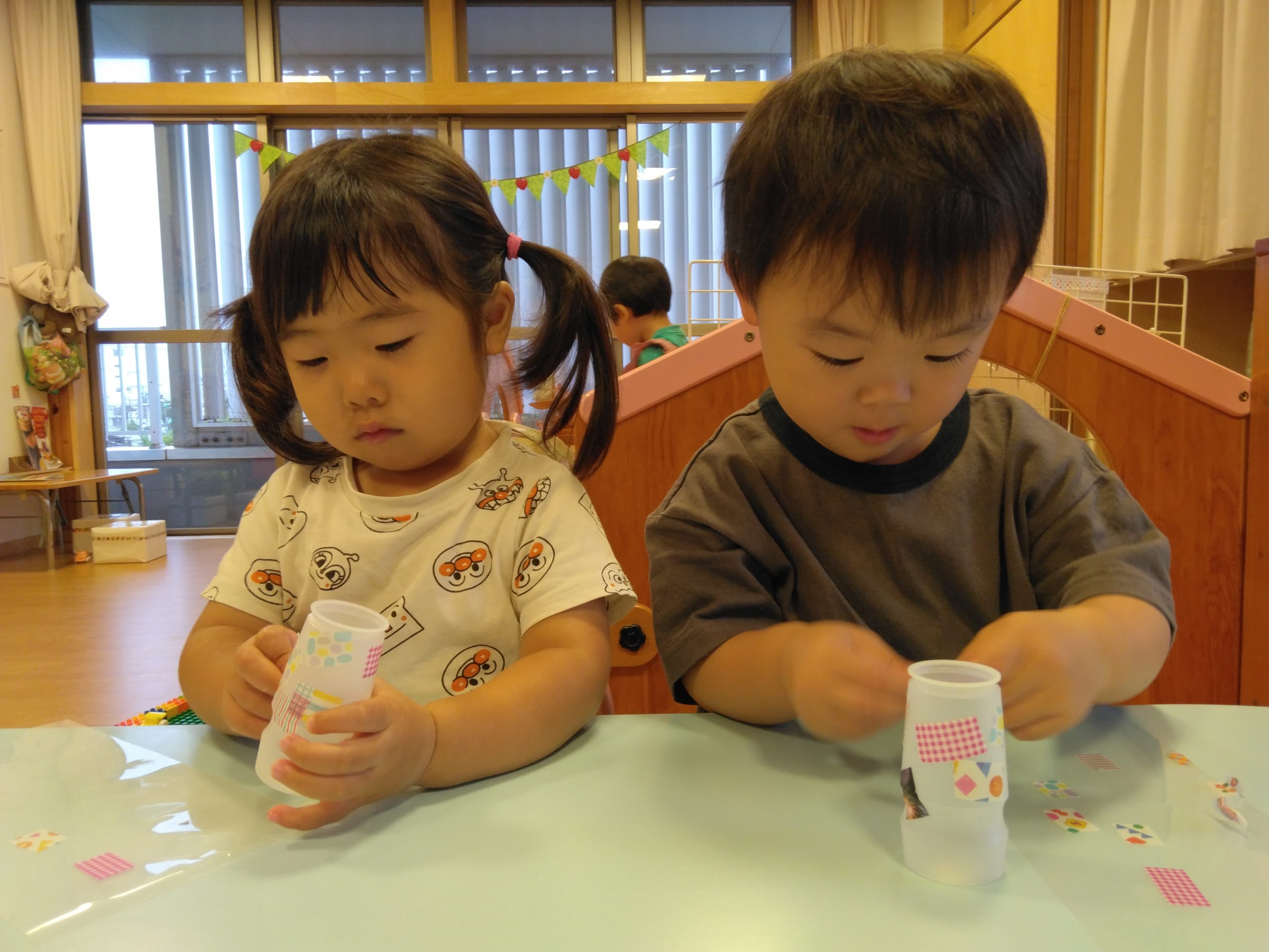 「○○色のシールがいい」「ハートがいい」など好きな色や柄のテープをじっくり選びながら貼っていました!