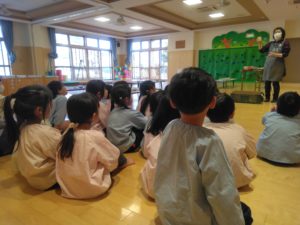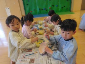 参観の時に、お家の人と作った物がどんな風になっているか・何色を付けるかドキドキの子どもたちでした。