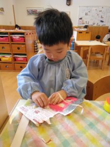 角と眉毛を貼ります。「ここに貼る!」「怒った顔にしよう」と貼る場所を考えていた子どもたちです。